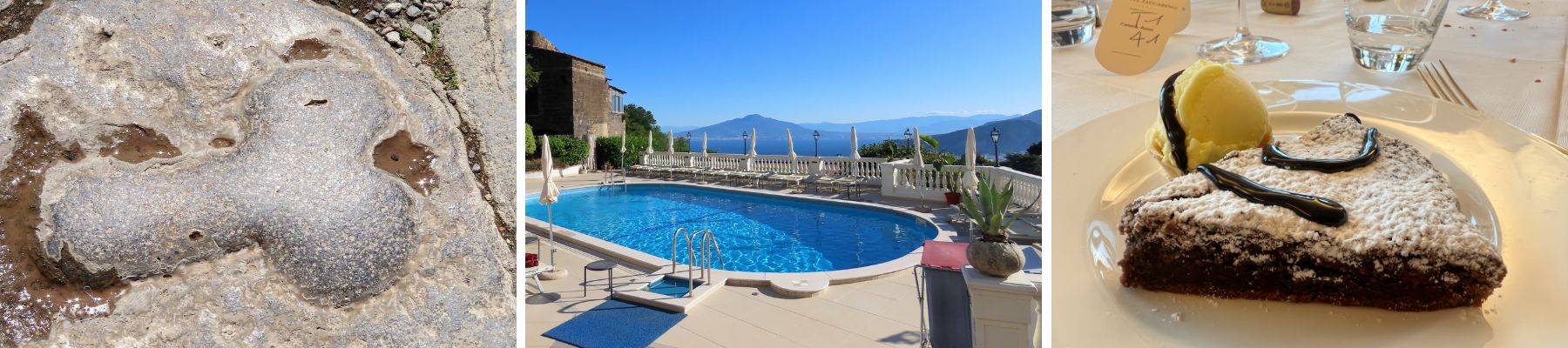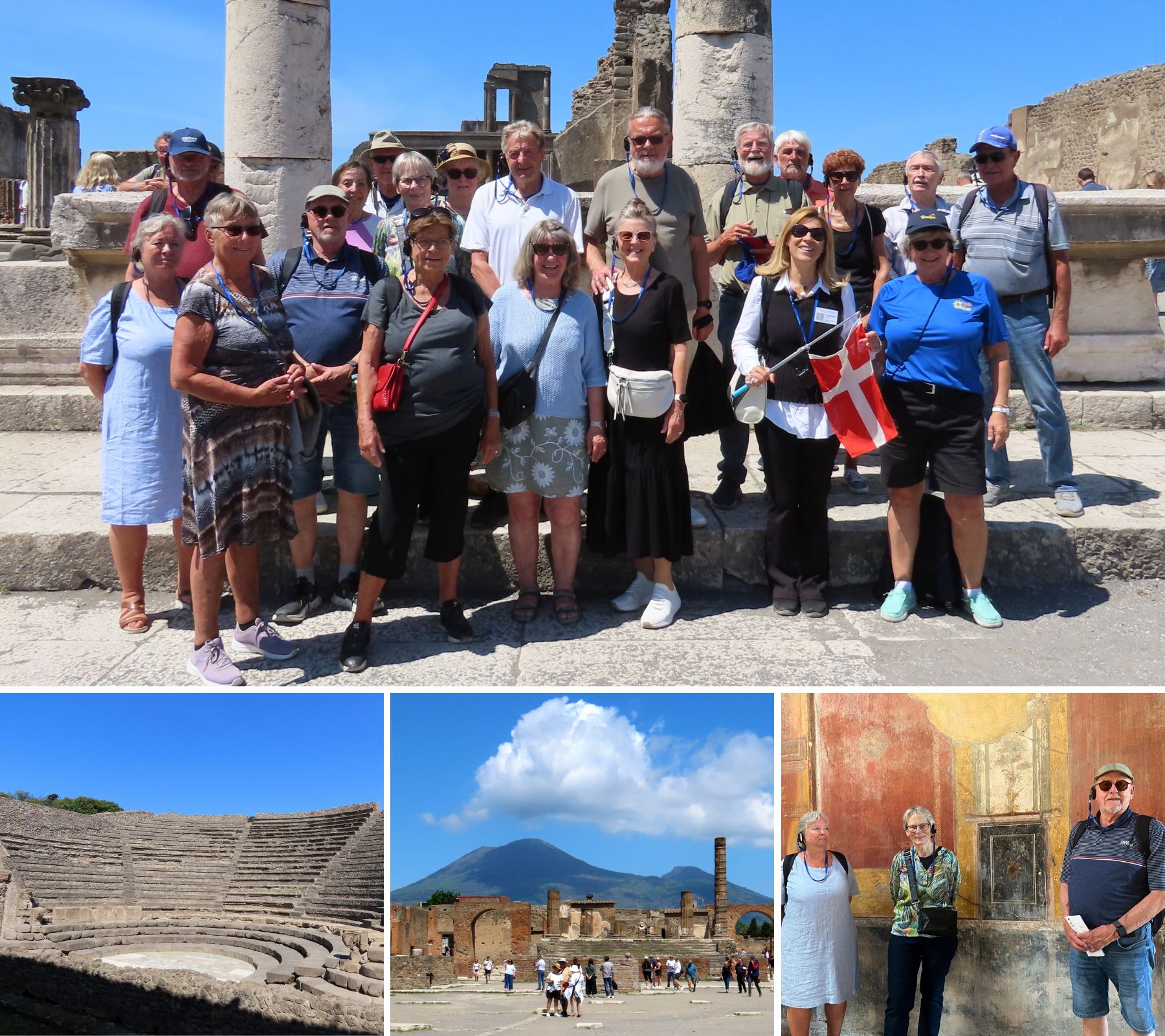 Det skulle ta flera dagar att se allt, men vi får ändå en god inblick i Pompejis historia innan vi avslutar med lunch vid entrén. Sallad, pizza och kaka står på menyn. Sedan bär det av tillbaka till hotellet och poolen. På vägen underhåller Helle oss med musik och historier.