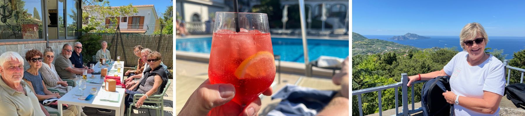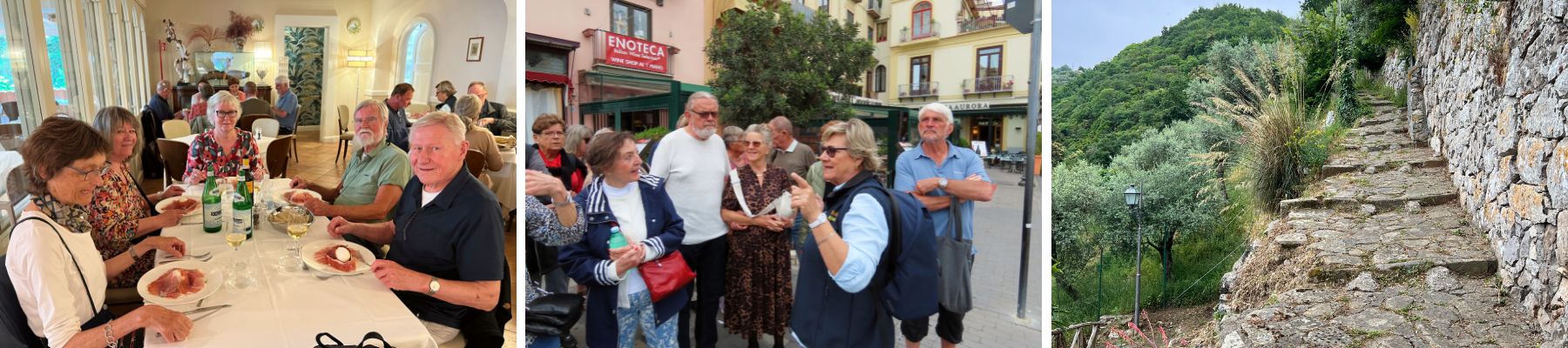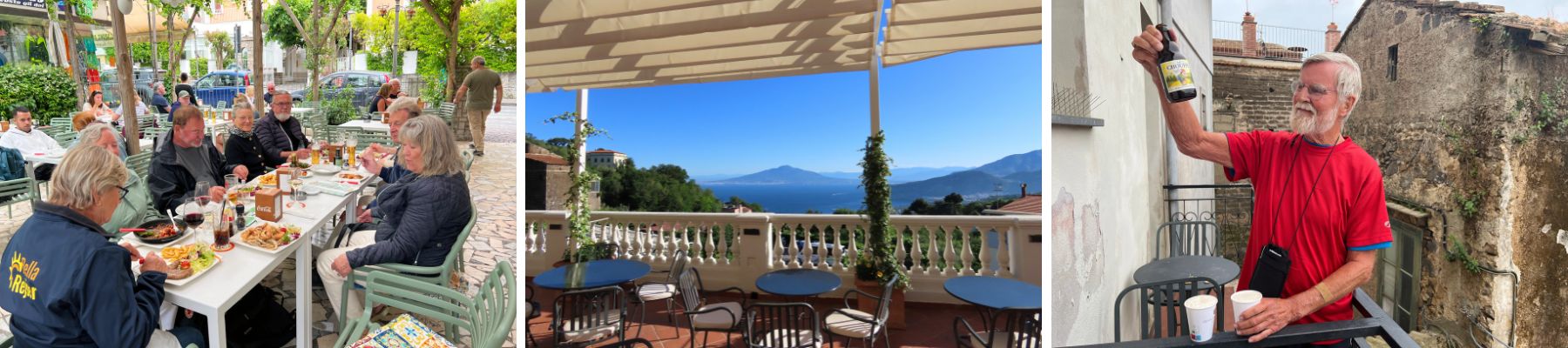 Snart går samtalen kring vad alla har gjort under sin lediga dag. Vi får höra om Herculaneum och se bilder på fantastiska målningar och mosaiker från antiken. Och Helle – trots att hon också är ledig – har tagit med några på en promenad till det lokala klostret. Det blev en stor succé. Vädret var så klart att de kunde se ända till Capri, och de hann också med ett trevligt stopp på Orlandos bar uppe i byn.