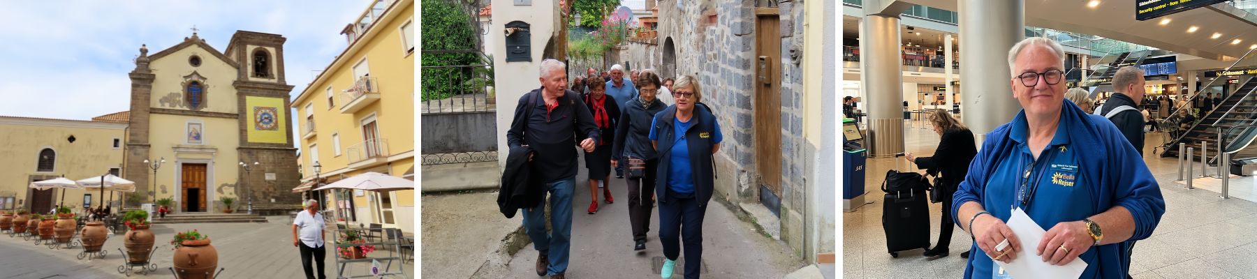 I Neapel välkomnas vi av Bella Resors trevliga reseledare Helle. Hemifrån har vi fått veta att vi ska åka buss i cirka 1,5 timme till hotellet i Sant’Agata sui Due Golfi, utanför Sorrento stad. Därför påminns vi om att köpa en flaska vatten och passa på att gå på toaletten innan avfärd. Ja, vi tas verkligen om hand på alla sätt.