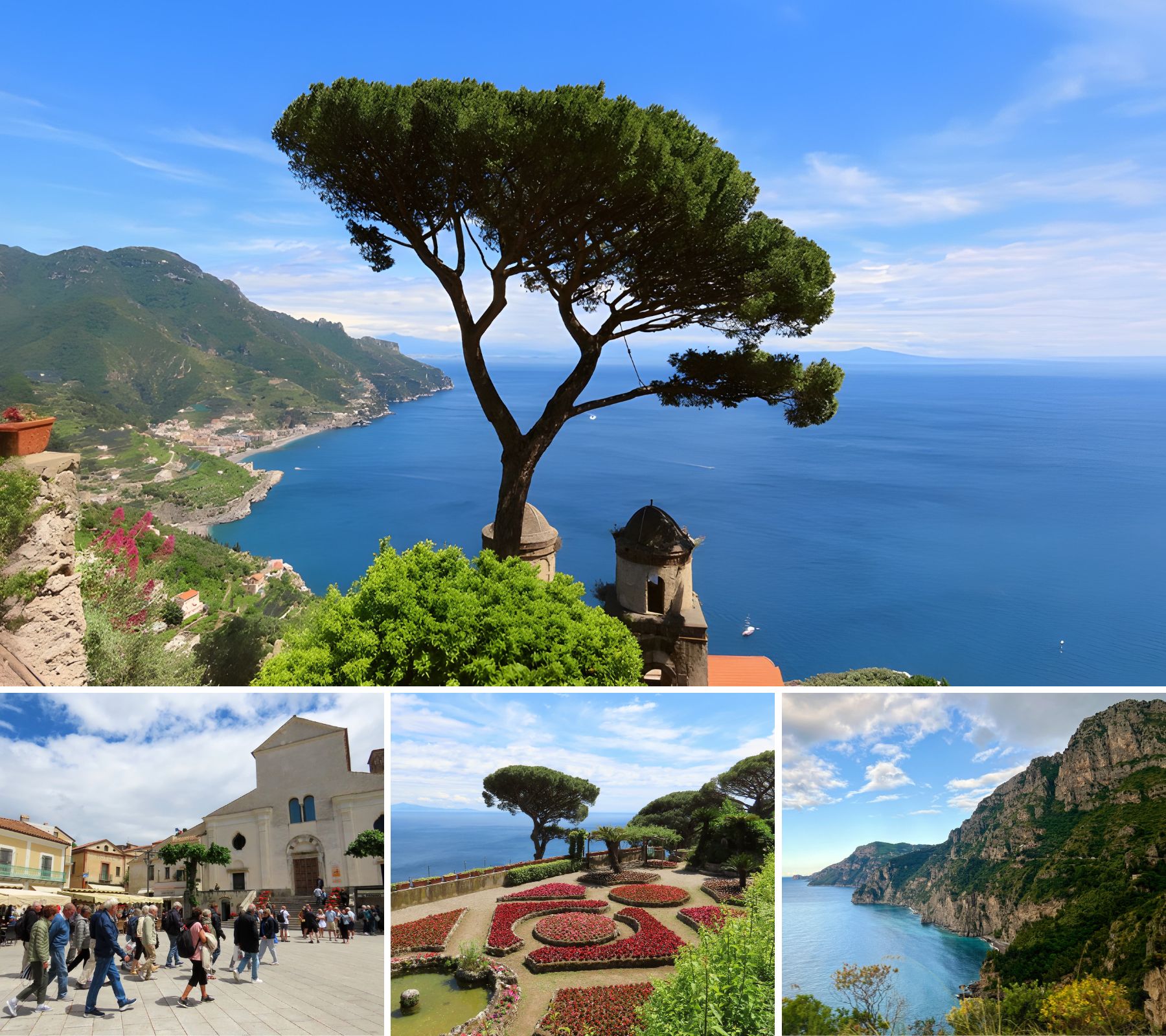 I Ravello väntar ännu en god lunch – sallad, pasta med aubergine och en kaka med citronkräm. När vi kommer ut igen har molnen blåst bort. Himlen är klarblå, bergen är frodigt gröna och de färgglada byggnaderna vid kyrktorget strålar. Nu är det verkligen som vykort.
