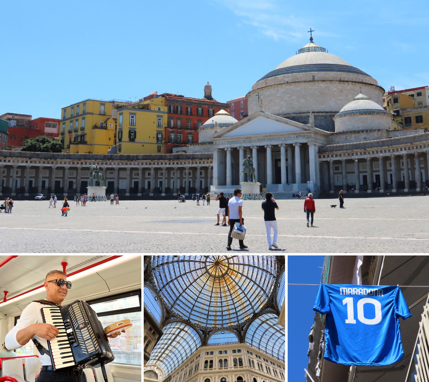 Det är därför ganska glest vid frukosten när den öppnar klockan 07.00. Men några morgonpigga finns vi ändå. Jag och ett par andra tar hotellets shuttlebuss in till Sorrento stad för att hitta tågstationen och tåglinjen Circumvesuviana. De andra siktar på den antika staden Herculaneum, medan jag åker hela vägen till Neapel. Resan tar ungefär 1 timme och 10 minuter. Strax före avgång kliver en dragspelare på tåget, utrustad med rytmbox, och fyller vagnen med musik. Det är svårt att inte bli glad.