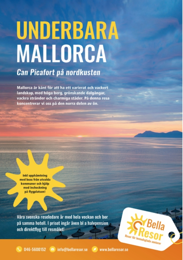 Under resan besöker vi de berömda Drakgrottorna, som innehåller Europas största underjordiska sjö. Vi besöker också huvudstaden Palma och upplever gamla stan i Alcudia. Dessutom tittar vi närmare på den kulinariska sidan av Mallorca och smakar på några av de många specialiteterna som ön är känd för.