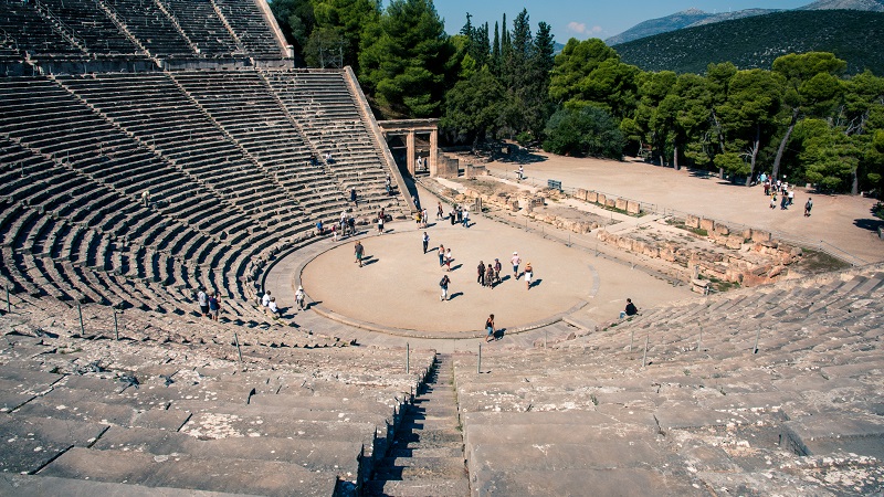 Peloponnesos är en stor halvö, ungefär hälften så stor som Danmark. Den stora amfiteatern i Epidaurus har 2 000 sittplatser och används än idag. Den togs upp på UNESCO:s världsarvslista 1988. Staden är uppkallad efter Apollons son, hjälten Epidaurus, och tros vara födelseplats för Apollons andra son Asklepios – antikens mest kända helare.