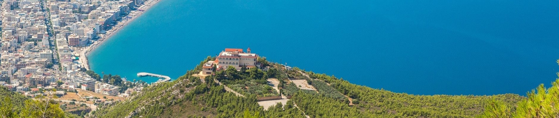 Vårt första stopp på dagens tur är klostret Osios Patapios. Från en höjd av nästan 700 meter över havet finns en fantastisk utsikt ner över Loutraki och Korintiska bukten. Nunnorna i det fortfarande aktiva klostret låter oss gästfritt titta på deras spartanska anläggningar och vi får möjlighet att ta in den speciella atmosfären. De sista 150 metrarna upp till klostret är trappor.
